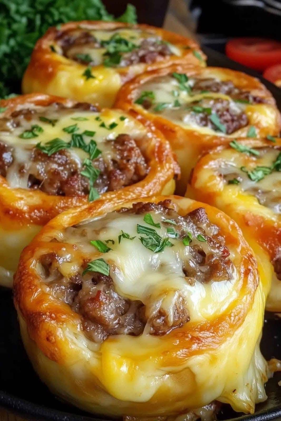 These savory pasta rolls ๐ are filled with seasoned ground beef ๐ฅฉ, topped with gooey melted cheese ๐ง, and baked to golden perfection. A comforting dish thatโs perfect for family dinners or festive gatherings! ๐