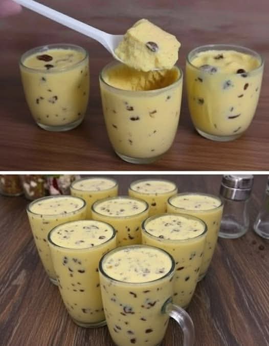 Serve in glass cups with visible raisins and glossy top 🌿. Ideal for ftour, parties, or chilled desserts 🍽️.