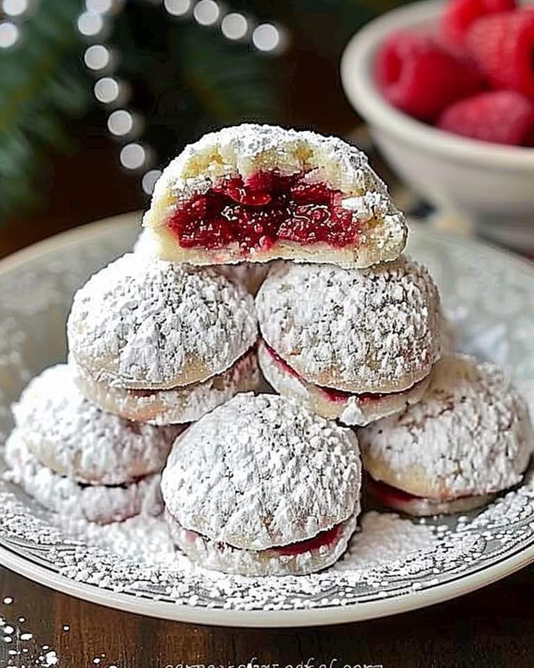 Raspberry-Filled Snow Cookies are crumbly, fruity, and festiveβ€”a tray of powdered joy πŸ“β„οΈπŸͺ.