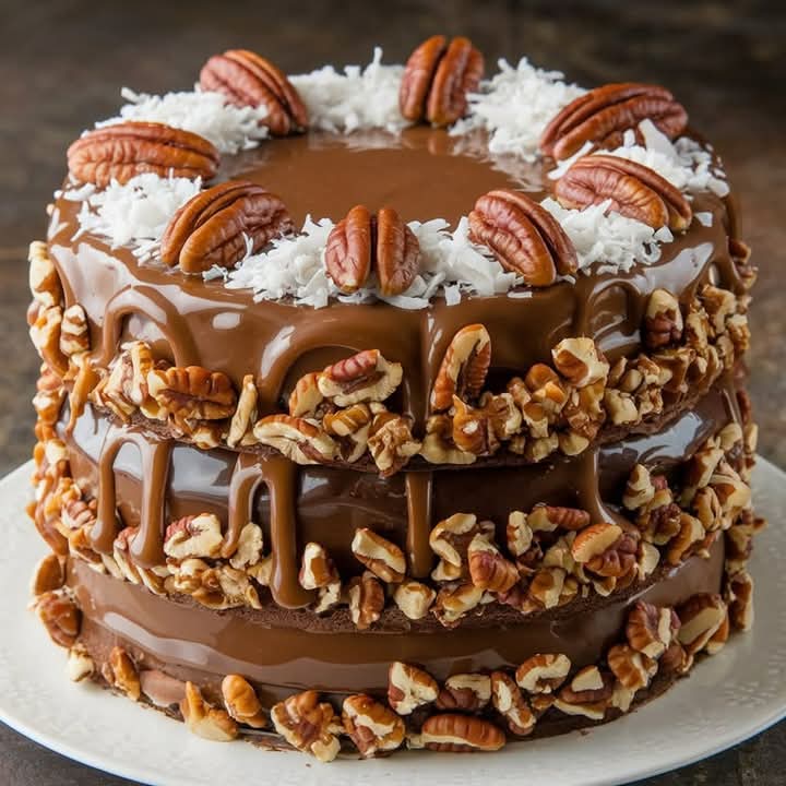 Luxurious Chocolate Caramel Pecan Cake โ€“ Decadent Layers with Ganache, Coconut & Caramel