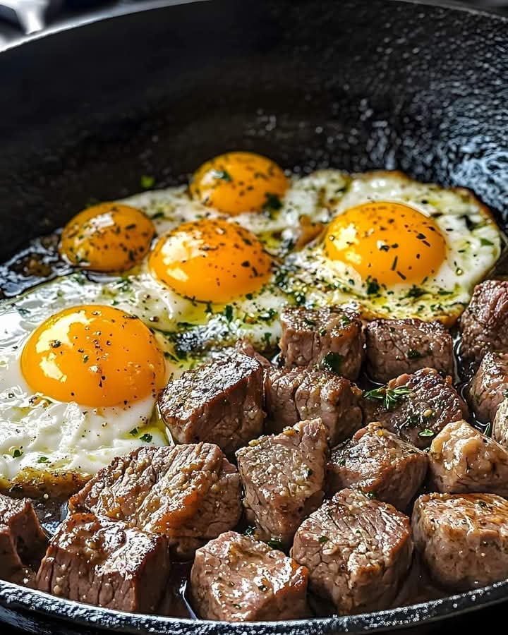 Kickstart your day with a hearty skillet of sunny-side-up eggs and perfectly seared steak cubes—simple, savory, and protein-packed.
