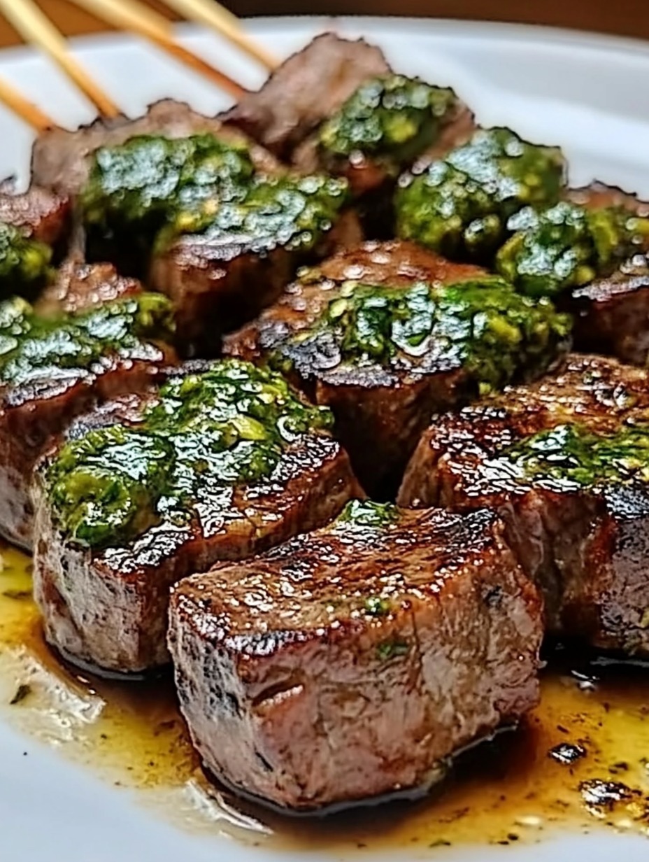 A summer classic! Juicy grilled beef skewers paired with vibrant, garlicky chimichurri sauce—perfect for cookouts and festive gatherings.