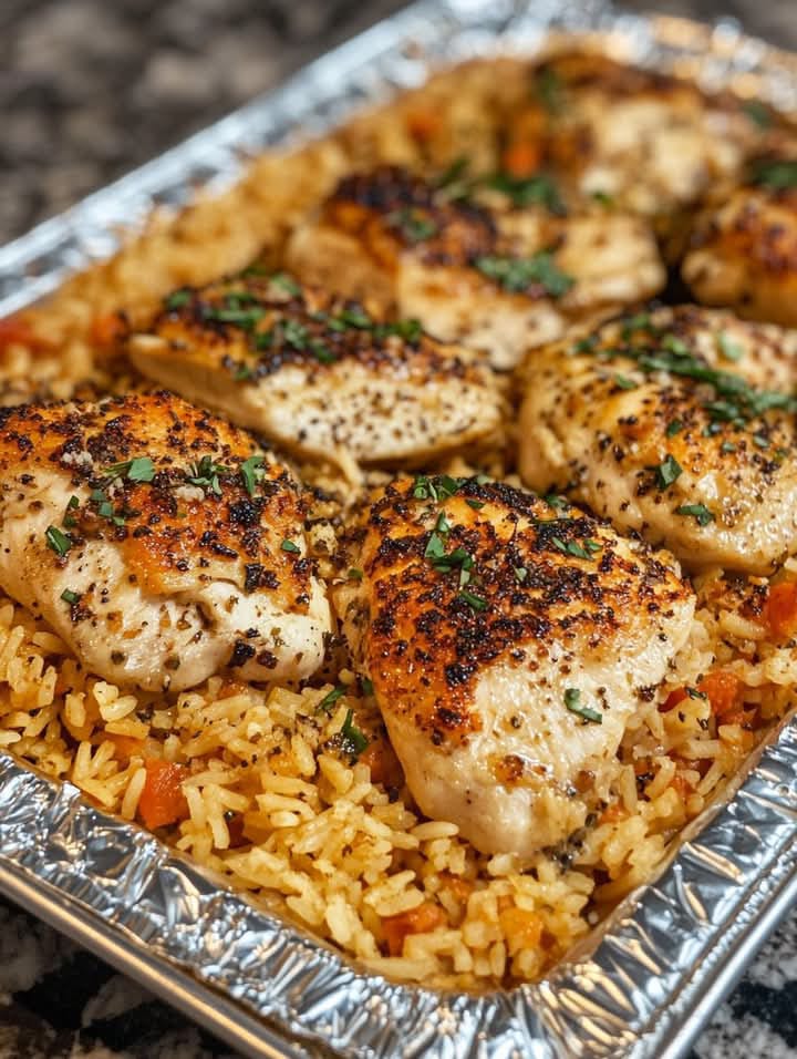 - Assemble the Dish: Spread buttery rice in foil dish. Arrange sliced chicken on top. Sprinkle with pepper, Parmesan, and oregano.