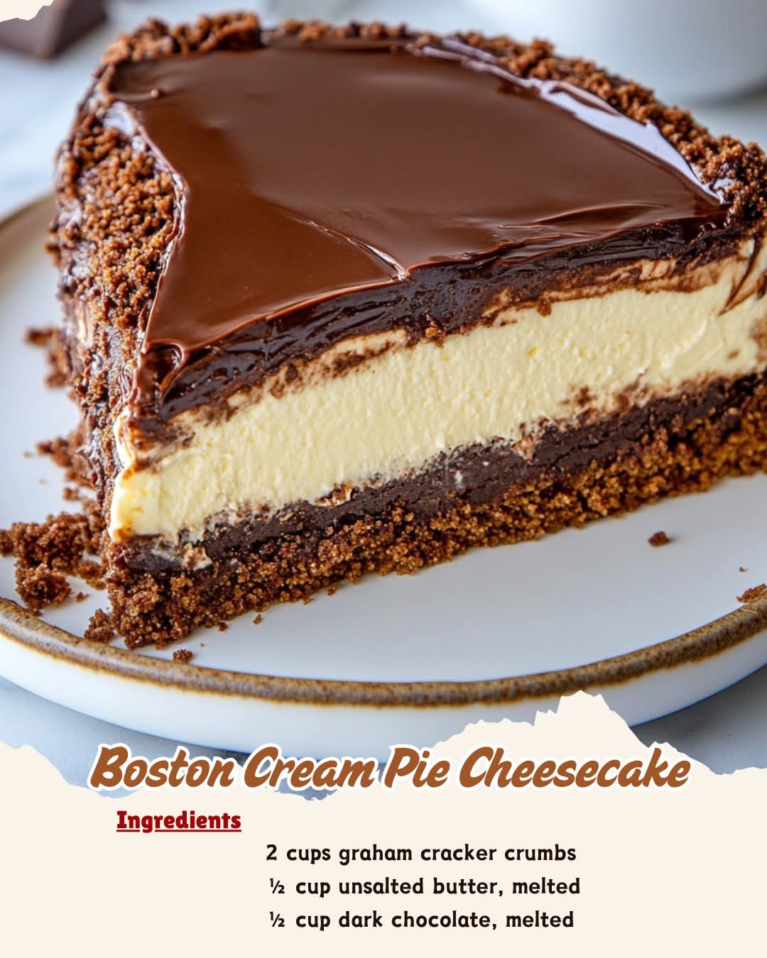 ✨ A rich, creamy, and chocolatey dessert that combines the best of cheesecake and Boston cream pie!
