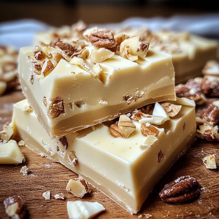 A rich, indulgent treat combining smooth white chocolate fudge with a crunchy praline topping.
