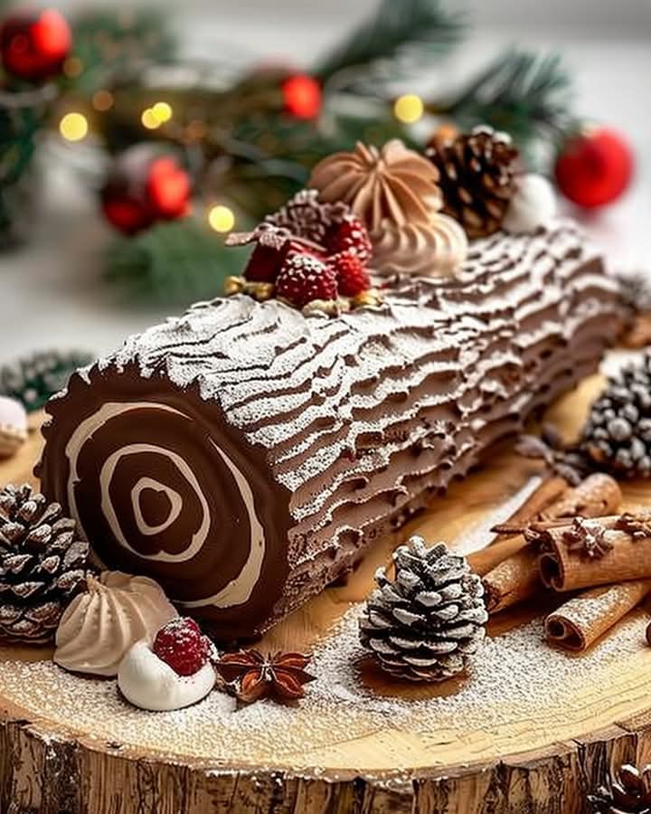 A festive holiday classic—light sponge cake rolled with cream filling and covered in rich chocolate ganache, decorated to look like a rustic log. Perfect for Christmas celebrations! ❄️