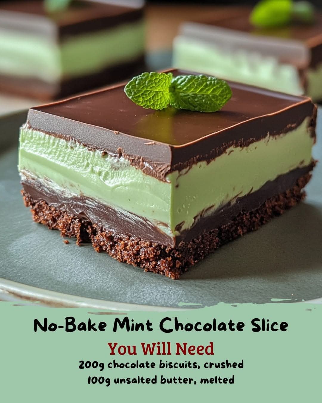 A creamy, refreshing mint-flavored slice layered with rich chocolate and a crunchy biscuit base—perfect for summer treats or festive gatherings!