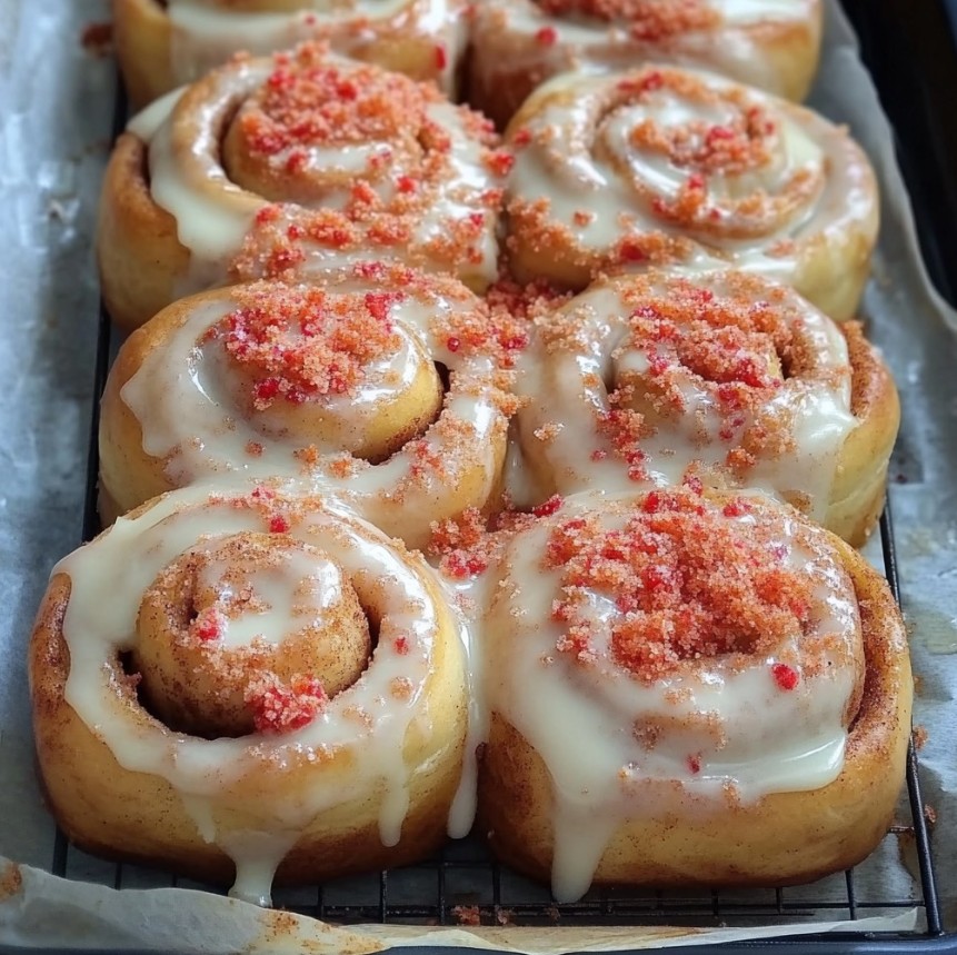 - Finish & Serve: Spread frosting over warm rolls. Sprinkle with strawberry crunch topping. Enjoy!