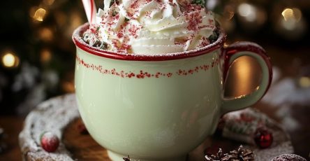 A creamy, snowy cocoa made with white chocolate and festive toppings—perfect for cozy winter mornings!