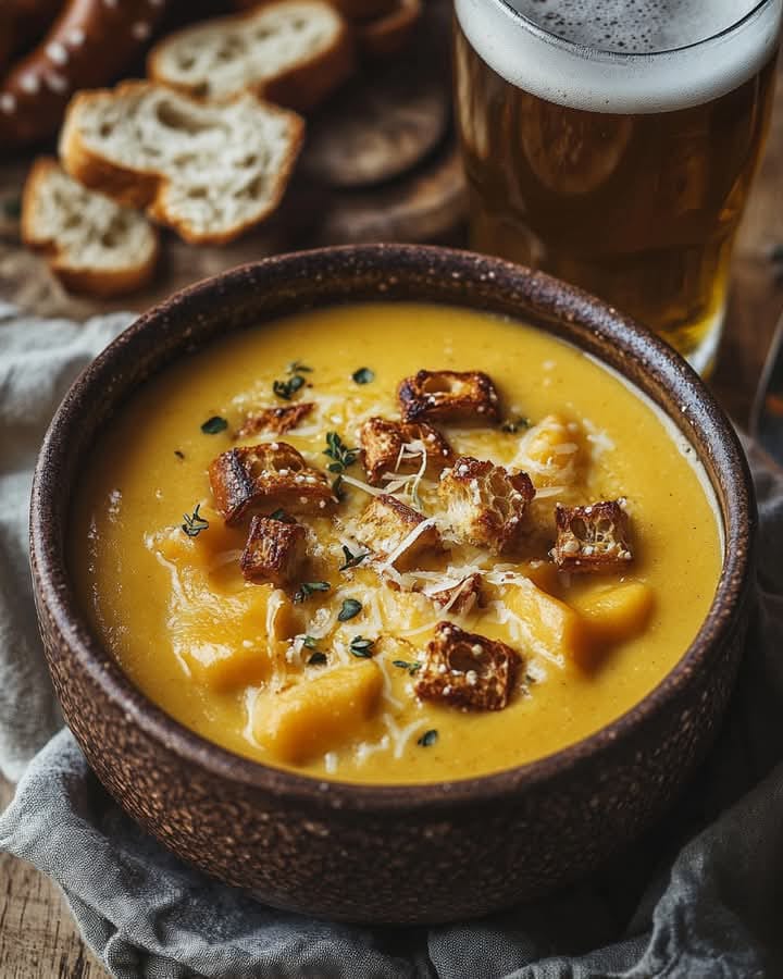 🥣 Onion & Beer Soup with Pretzel Croutons 🍺🧀✨