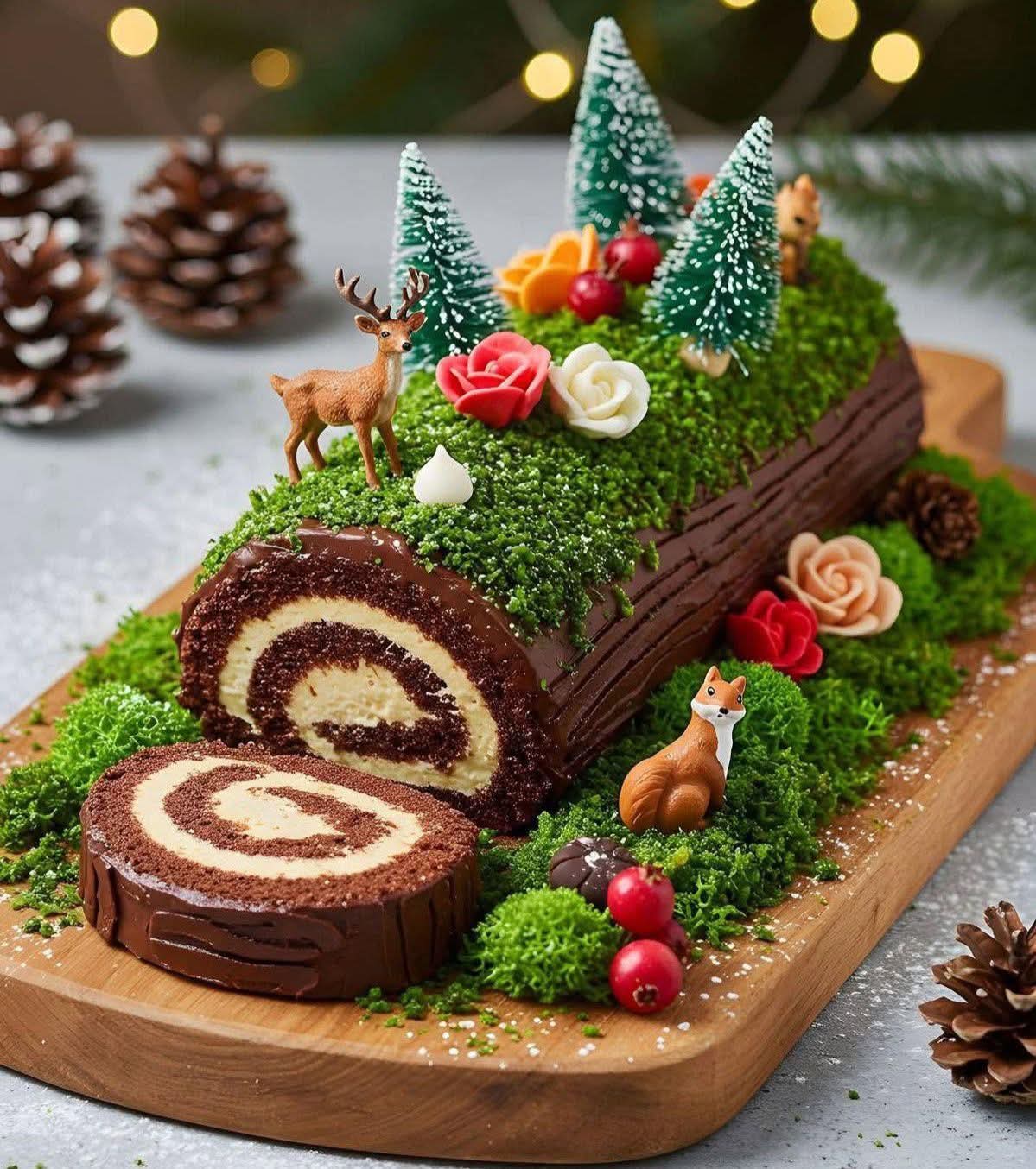 A festive chocolate sponge roll filled with cream, coated in ganache, and decorated like a magical forest.