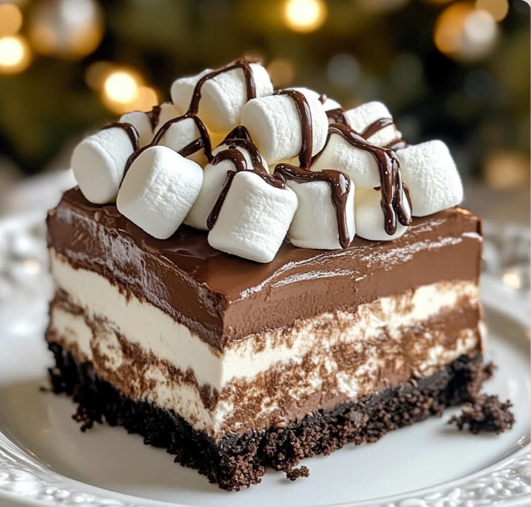 ✨ A fun, layered dessert that tastes like hot chocolate in sliceable form—perfect for holiday parties!