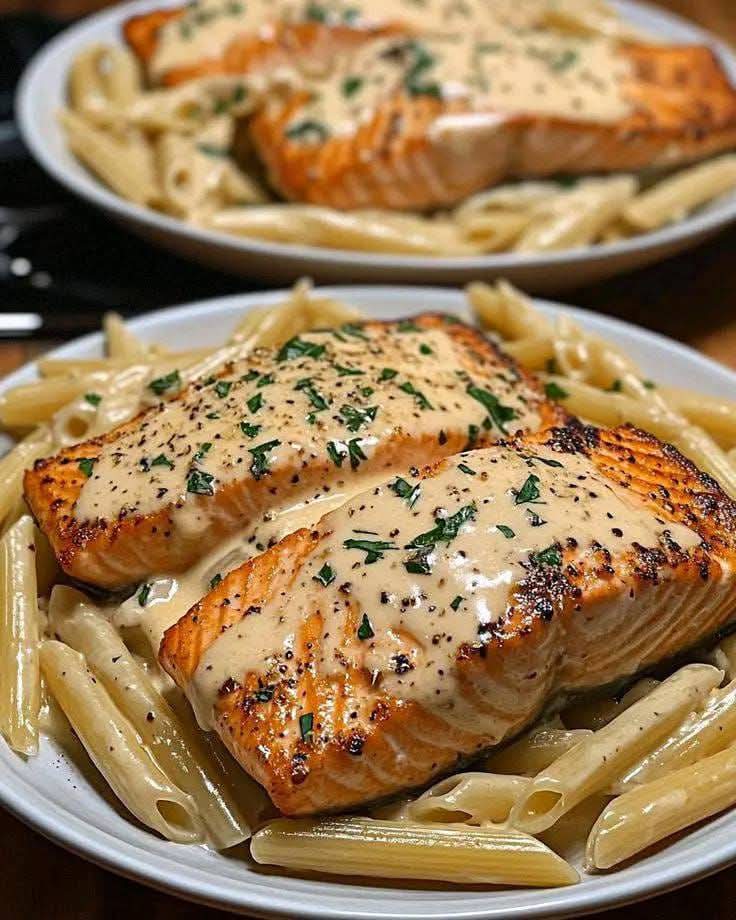 Golden-seared salmon fillets served over penne pasta coated in a rich garlic Alfredo sauce—elegant, comforting, and packed with flavor!