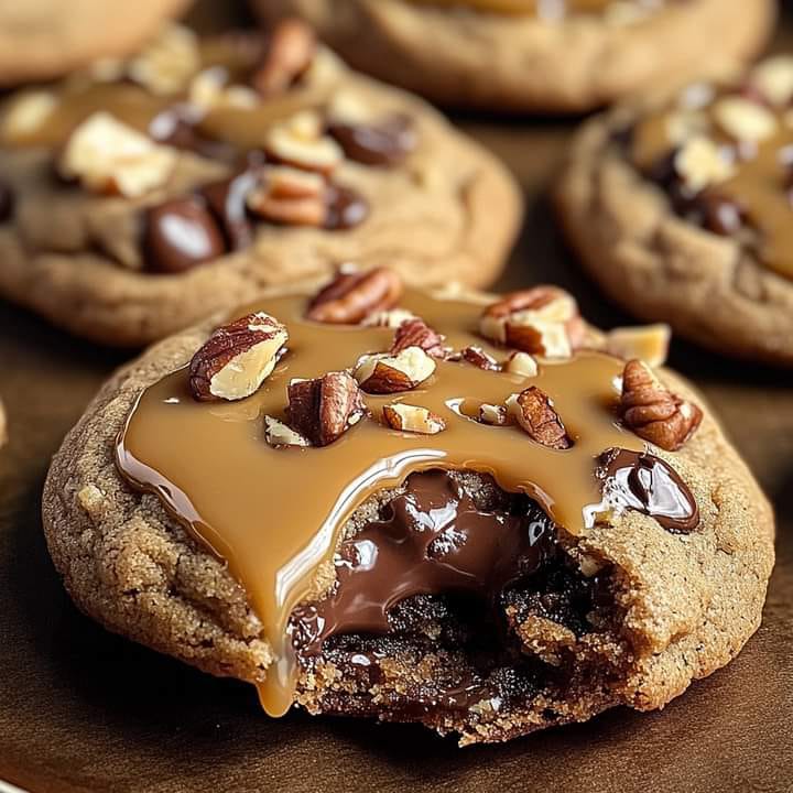 Soft, chewy cookies loaded with chocolate chips, crunchy pecans, and gooey caramel centers—pure indulgence!