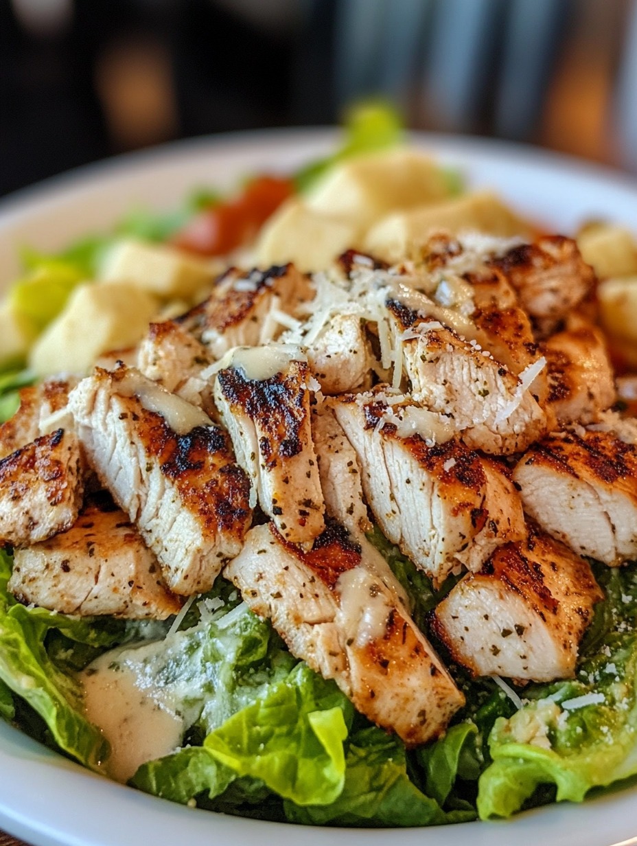 - Add the Chicken: Top salad with sliced grilled chicken. Garnish with extra Parmesan or croutons if desired.