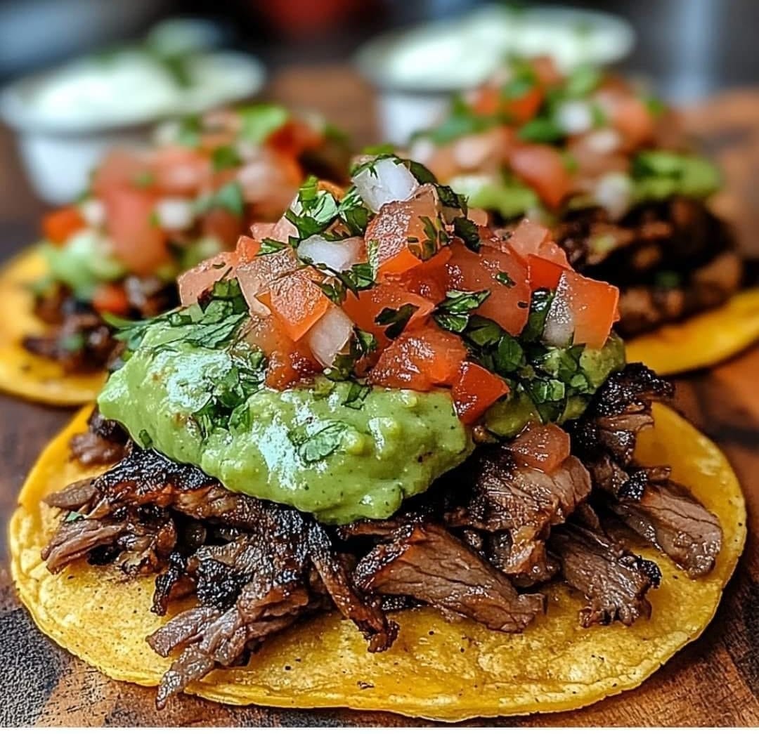 Flavor-packed tostadas topped with juicy carne asada, creamy guacamole, and fresh garnishes—perfect for a fiesta!