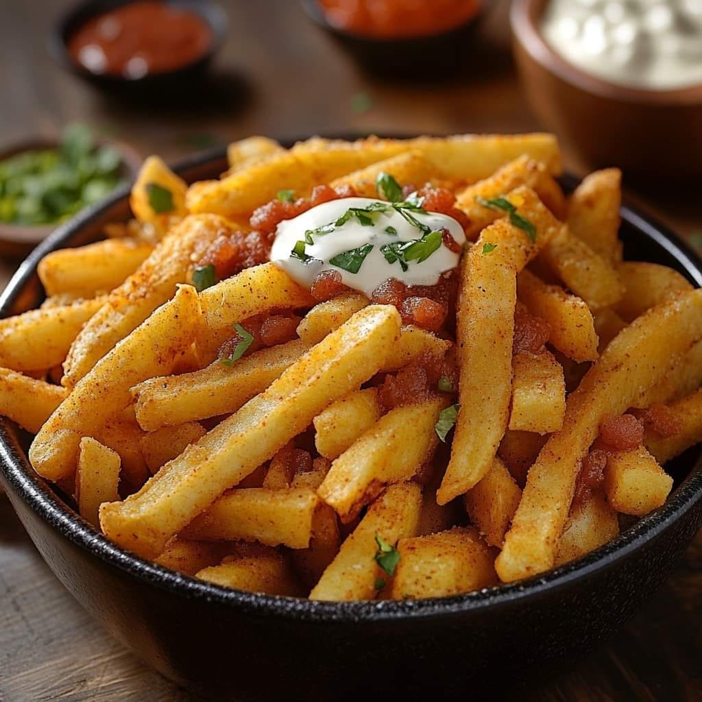 - Prepare the Fries: Preheat oven to 425°F (220°C) or deep fryer to 375°F (190°C). Toss potatoes in olive oil. Mix chili powder, paprika, garlic powder, onion powder, cumin, salt, and pepper; sprinkle over fries. Spread on parchment-lined sheet. Bake 25–30 minutes (flip halfway) until golden and crispy, or fry 3–4 minutes until crisp.