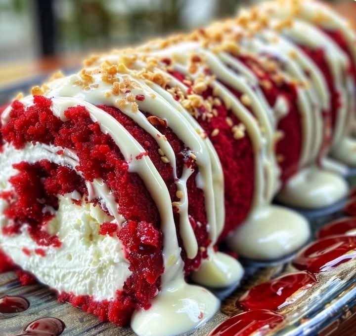 A creative dessert twist—red velvet cake rolled with cheesecake filling, topped with pecans, white chocolate, and berry drizzle.