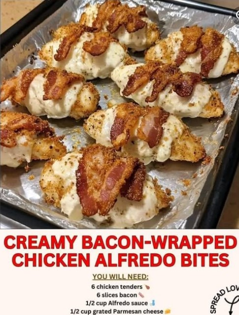 Juicy chicken tenders wrapped in smoky bacon, baked to perfection, and topped with creamy Alfredo sauce—an irresistible appetizer or main dish!