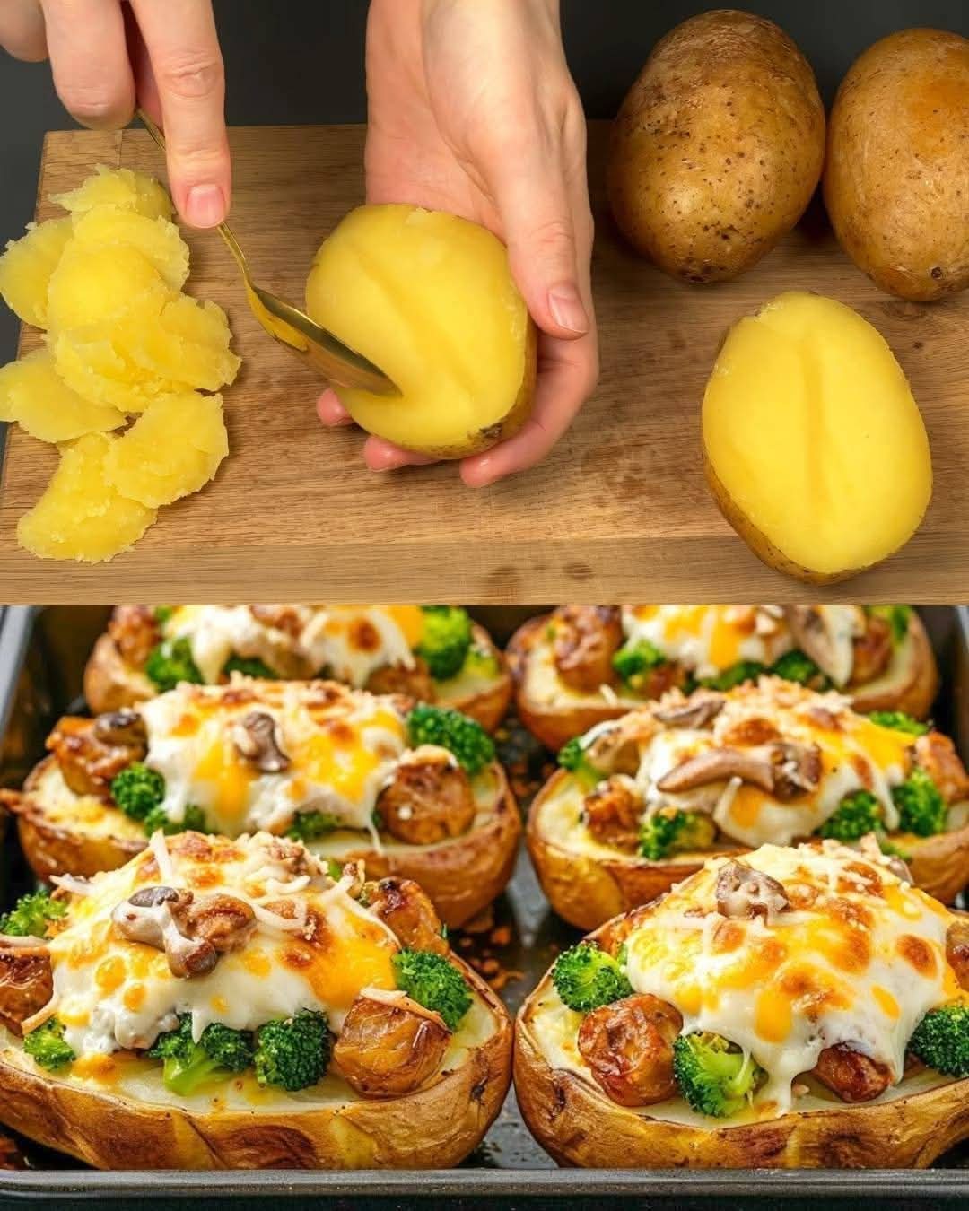 Caption: “Stuffed Baked Potatoes—golden shells, hearty filling, and cheesy topping 🥔🍗🥦🧀✨”