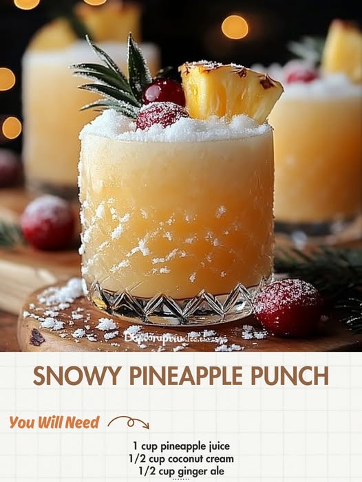 Caption: “Snowy Pineapple Punch—creamy coconut, sweet pineapple, and sparkling holiday cheer 🎄❄️🍍🥥✨”