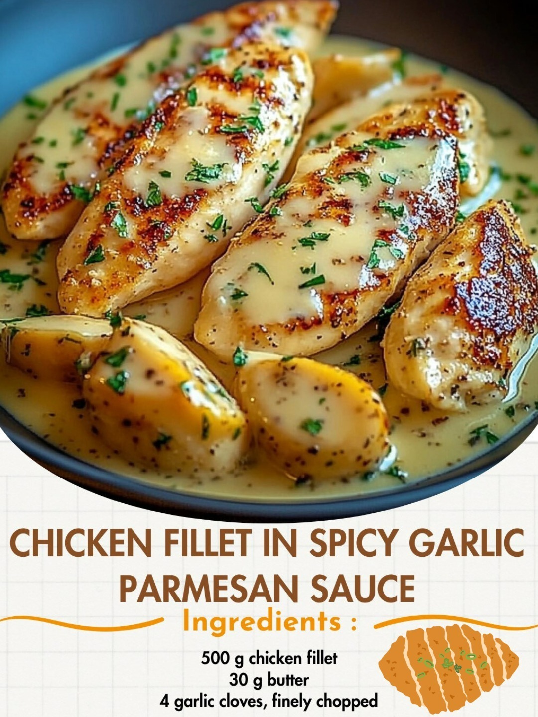 Caption: “Chicken Fillet in Spicy Garlic Parmesan Sauce—creamy, cheesy, and full of flavor 🍗🧄🧀🔥✨”