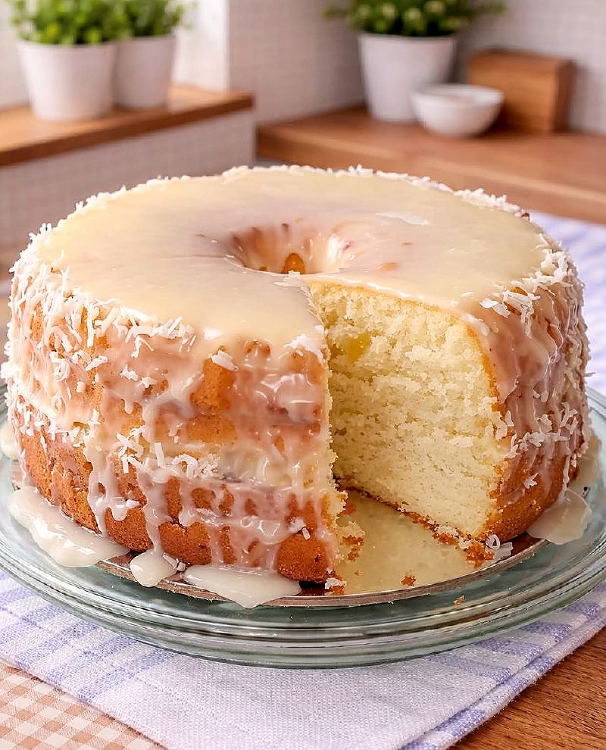 Caption: “Soft Coconut Glazed Cake—gentle sweetness, cozy comfort 🥥🍰✨”