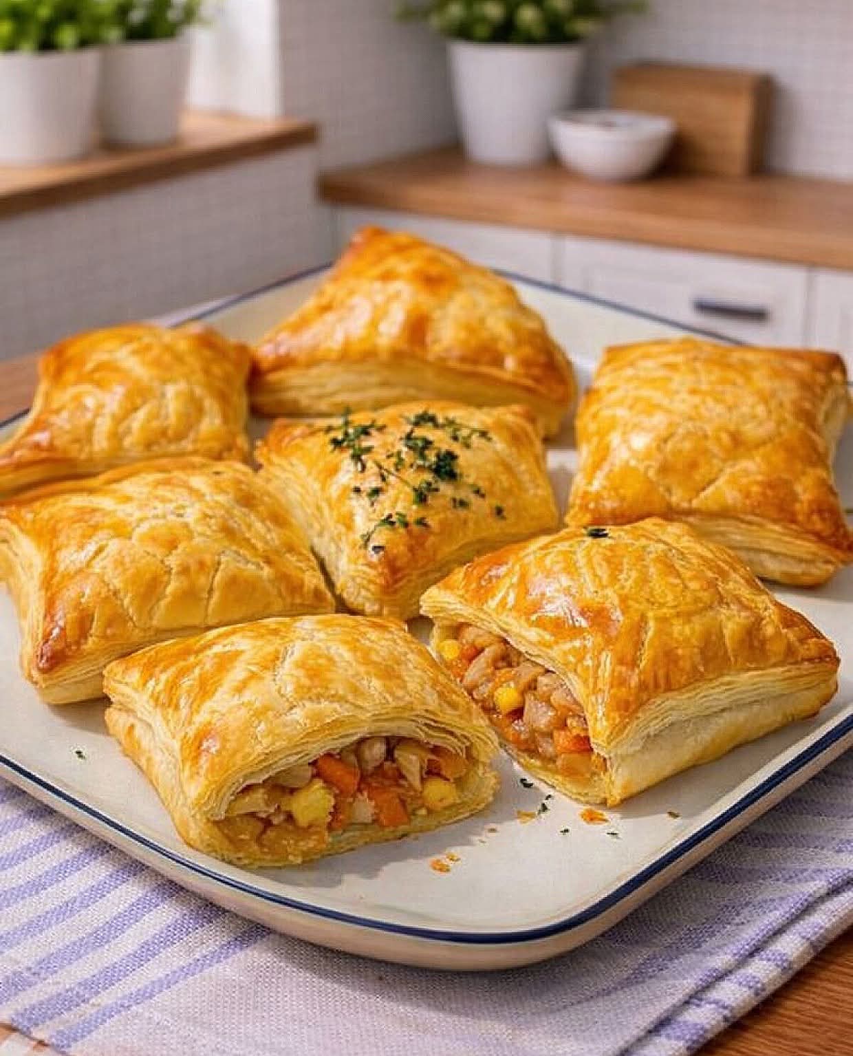 Caption: “Golden Chicken Puff Pastry Pockets—flaky, savory, and cozy 🥐🍗✨”