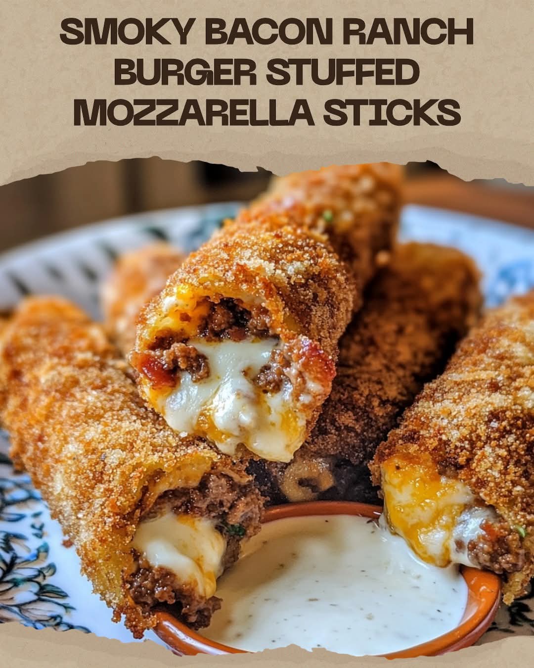 Caption: “Smoky Bacon Ranch Burger Mozzarella Sticks—crispy, cheesy, and irresistible 🥓🍔🧀✨”