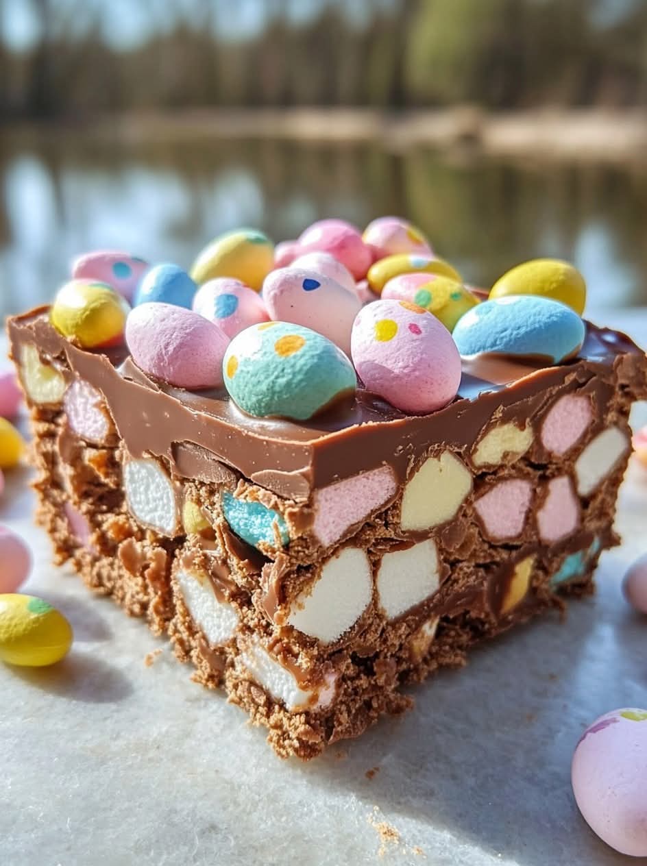 Caption: “Festive Chocolate Rocky Road Bars—crunchy, chewy, and colorful 🐣🍫✨”