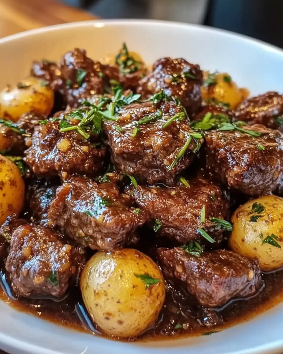 Caption: “Garlic Herb Butter Beef Tips with Baby Potatoes—slow-simmered, tender, and comforting 🥩🧄🥔✨”