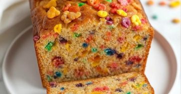 Fruity Pebbles Bread 🌈 Fruity Pebbles Bread 🍞✨ A colorful, fun, and moist quick bread packed with crunchy Fruity Pebbles…